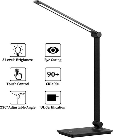 黒のLEDデスクランプ、3レベルの明るさのタッチコントロールテーブルランプ、オフィスの調整可能なアーム折りたたみ式デスクライト