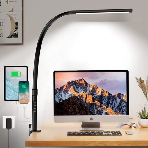 ホームオフィスデスクランプ-USB C A充電ポート付きデスクランプ、クリップ付きフレキシブルグースネックLEDデスクランプ、5つのモード、